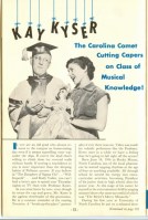 Young Sue Bennett, fresh from college and with a desire to sing professionally, began to appear on some of those early programs originating in New York, including one hosted by bandleader Vincent Lopez. An even bigger name provided her first starring opportunity when bandleader and entertainer Kay Kyser brought his College Of Musical Knowledge to TV and she became one of the main singers. He’d been a huge star for years, and his orchestra and comedy bits were customer favorites, especially his routines with comedy sidekick, Ish Kabibble (whose real name was Merwyn Bogue). One of the interesting inside facts in the book that came to light via the author’s later interviews, is that Kyser and Bogue were not on speaking terms offstage for some of their time together.